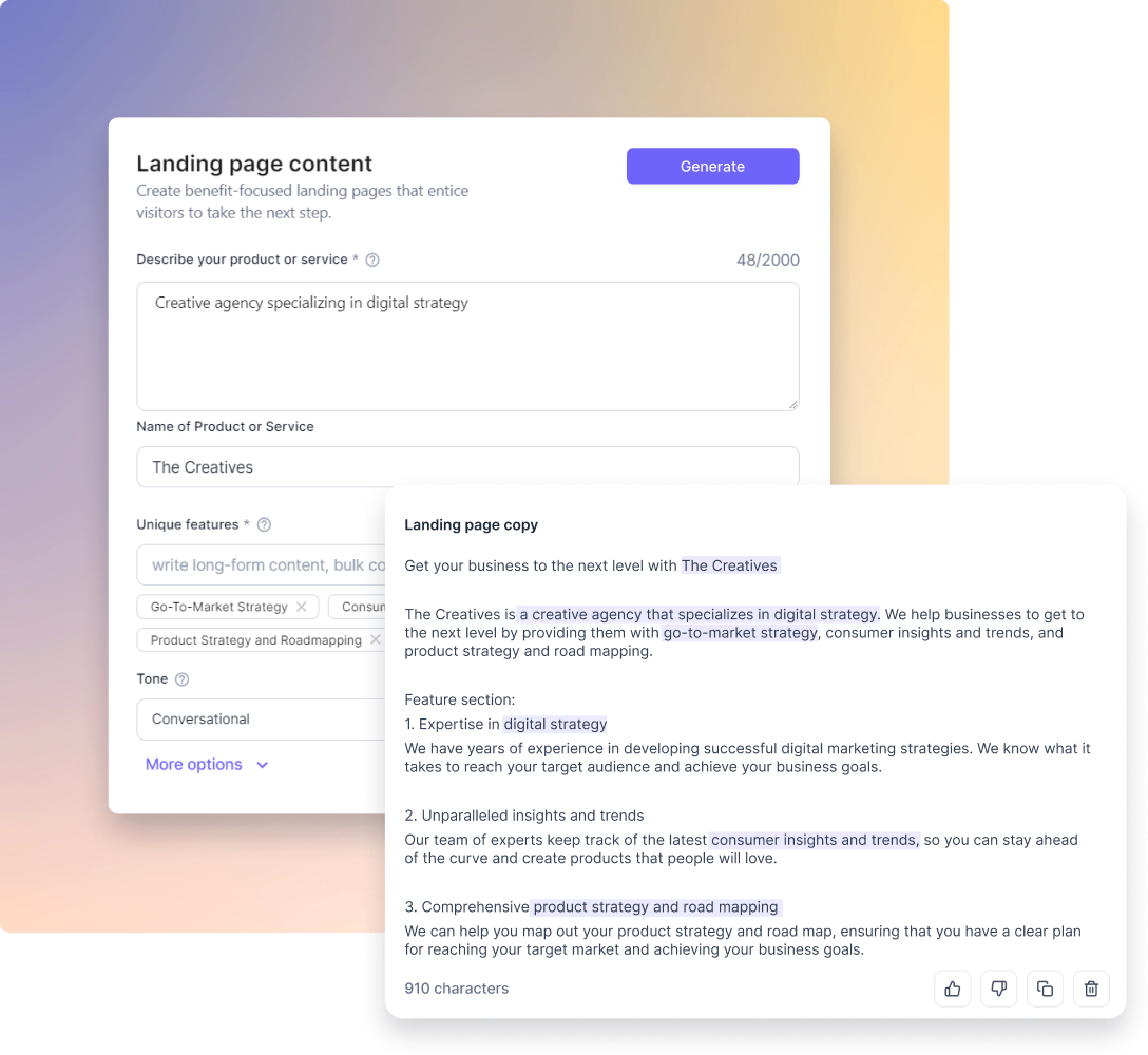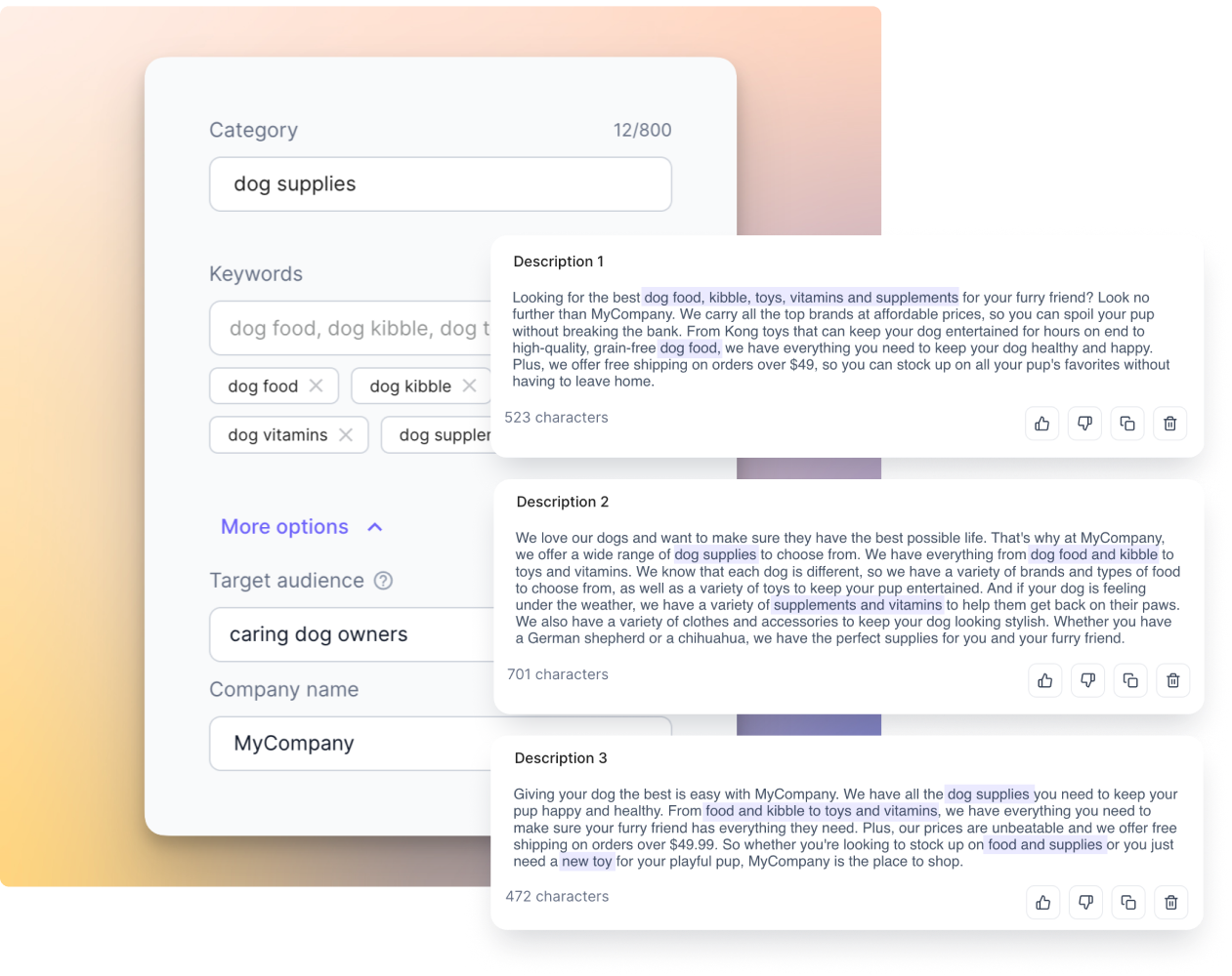 I can produce hundreds of descriptions at once, easily customizing tone, style & content to match our brand voice exactly—decreasing production time, freeing up resources and dramatically improving our overall user experience.