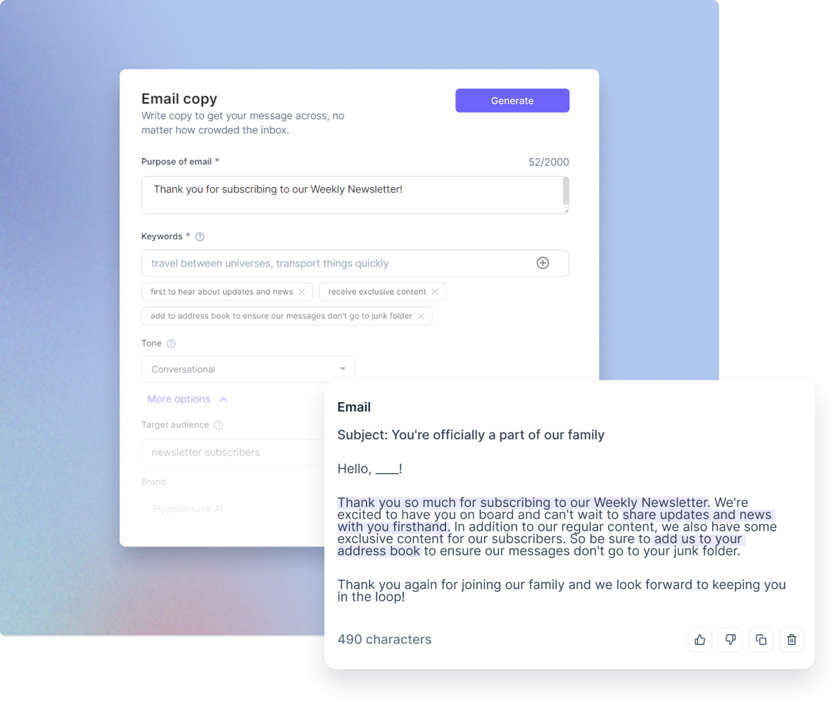 "We write hundreds of pieces of content monthly, and needed to quickly implement an elegant solution. Hypotenuse is hands-down the best tool that’s quick, easy, reliable & scalable.”