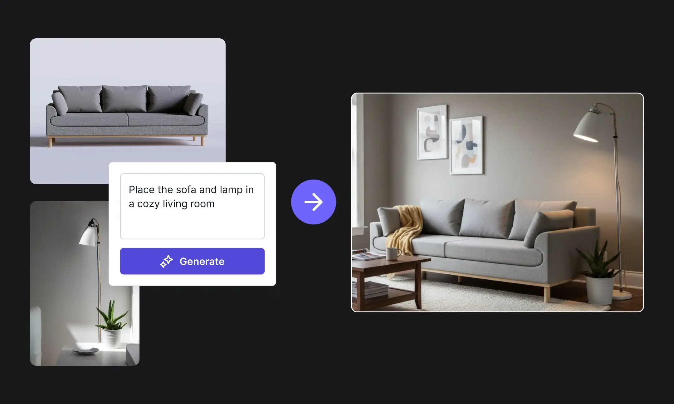 - Transform simple studio shots into styled room scenes with realistic proportions