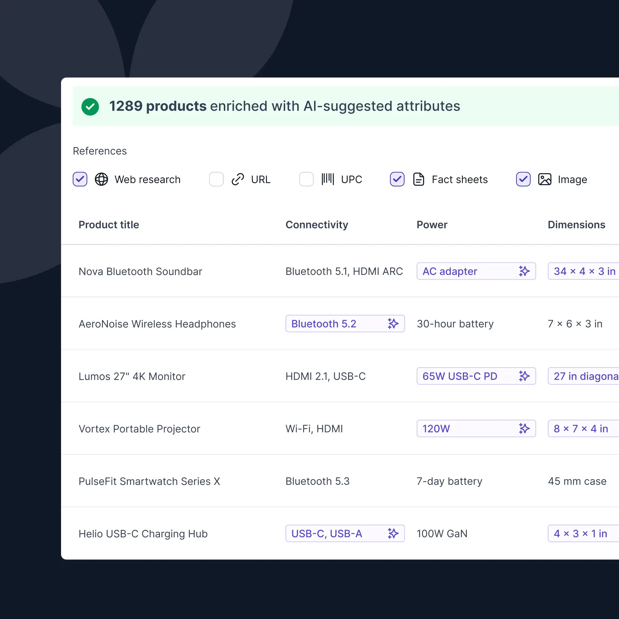 AI manages the repetitive work of organizing technical specs, resolving inconsistencies, and filling gaps in supplier inputs. Product data stays clear, structured, and ready for downstream teams without constant intervention.