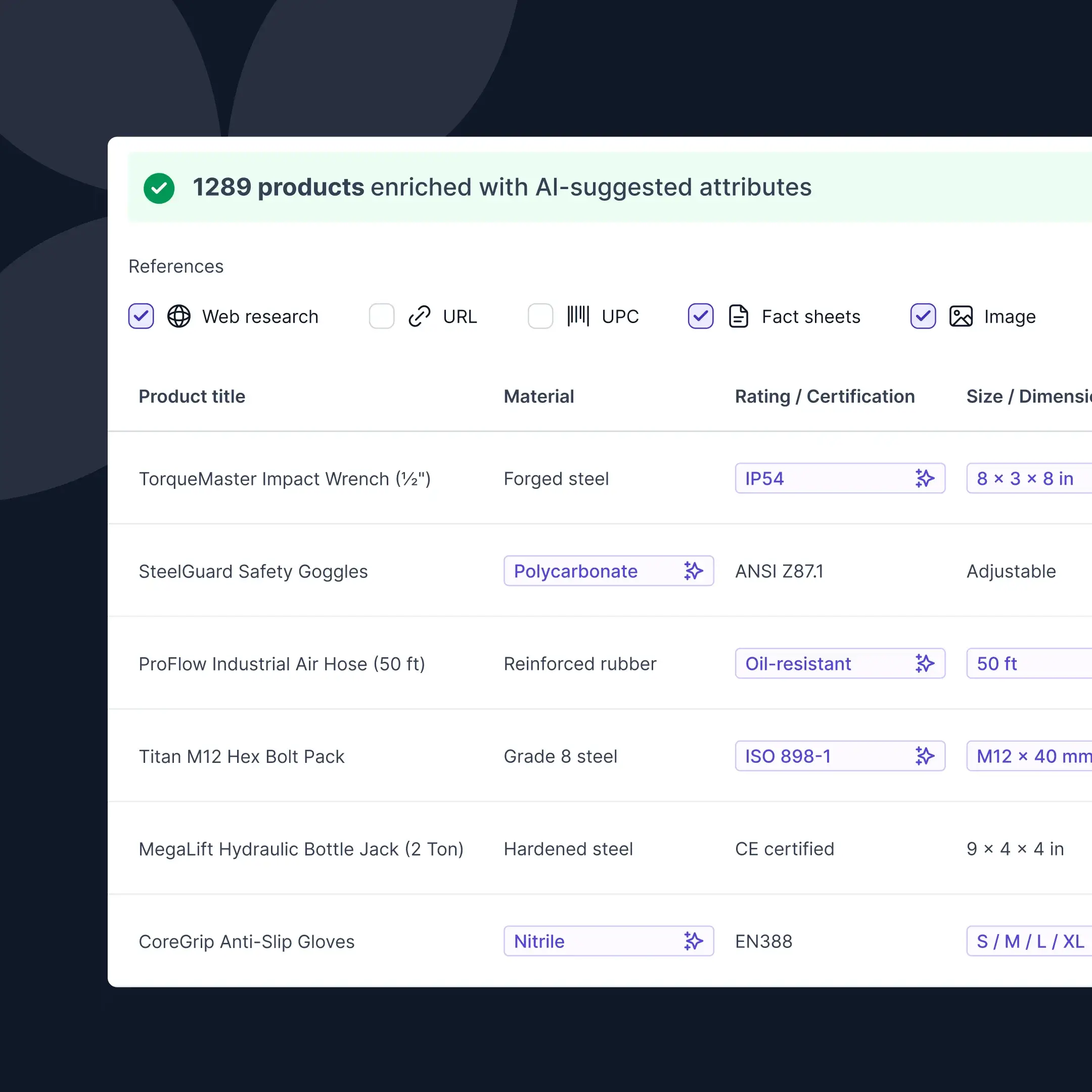 Every attribute is checked, validated, and completed so specs and safety details stay correct across categories. Meet marketplace and regulatory requirements with fewer revisions, and provide precise specs that prevent misorders and unnecessary returns.