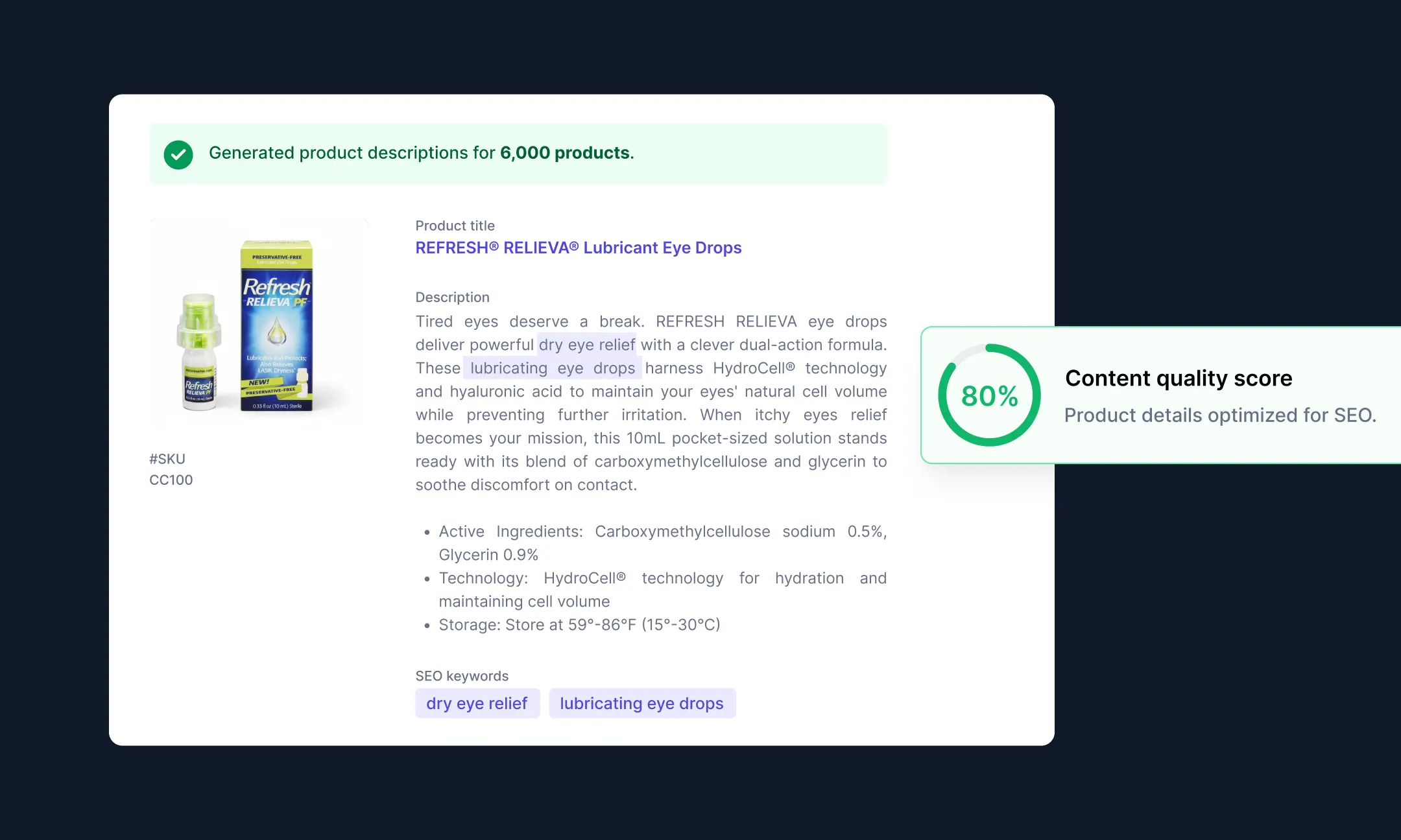 Onboarding new products from suppliers often stalls on data cleanup. With AI-powered enrichment and bulk description generation, products move from supplier feed to live catalog faster.